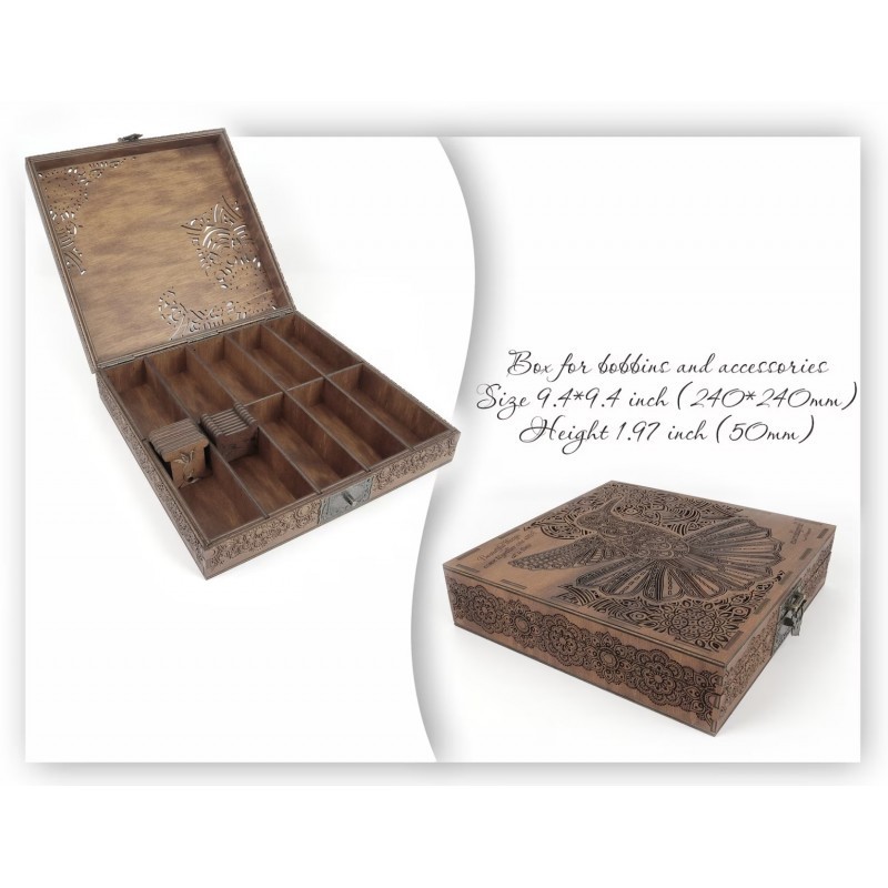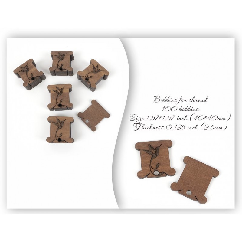 Это отличный набор из 100 деревянных бобин, одной деревянной коробки, двух магнитов для игл, футляра для ножниц, футляра для игл, инвентарной карты для нитей DMC.