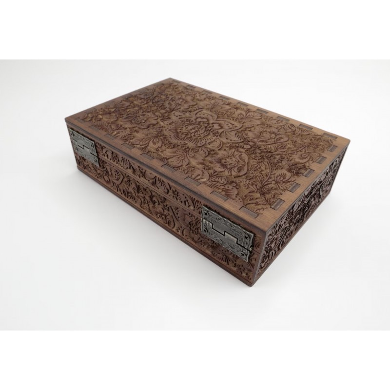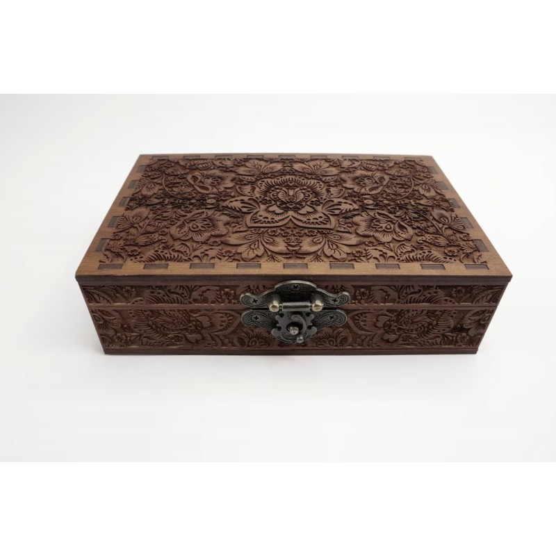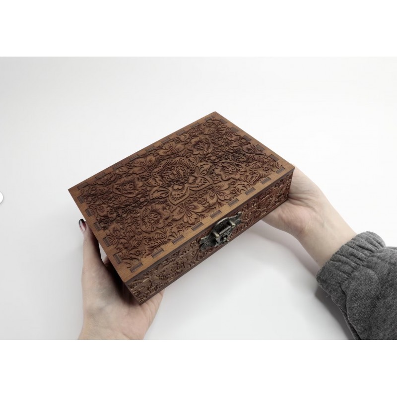 Размер деревянной шкатулки – 4,9x7,3x1,8 дюйма (125x185x45 мм).