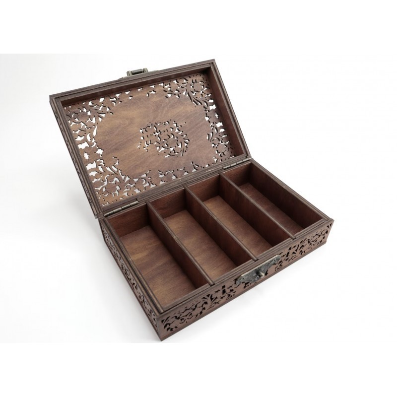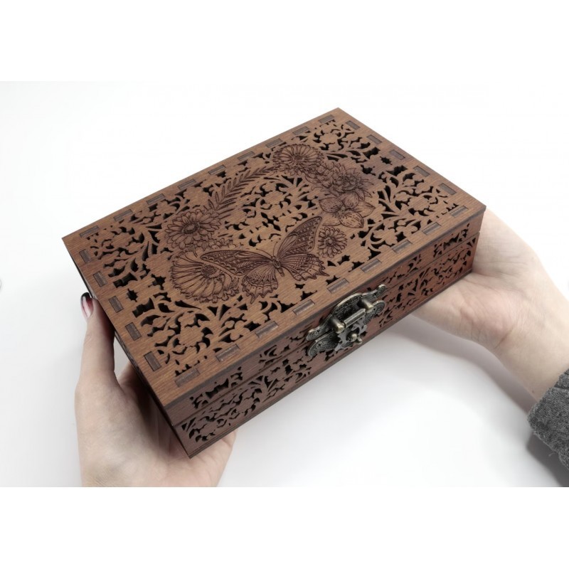 Размер деревянной шкатулки – 4,9x7,3x1,8 дюйма (125x185x45 мм).