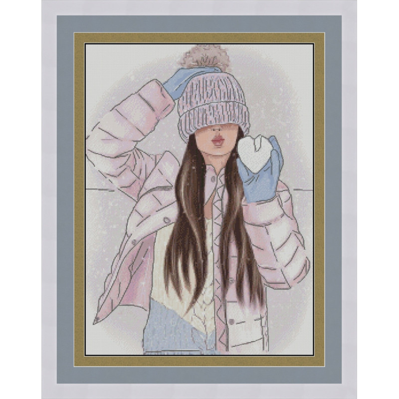 Девушка со снежным сердечком Электронная схема для вышивания крестиком Л-0009ИХ