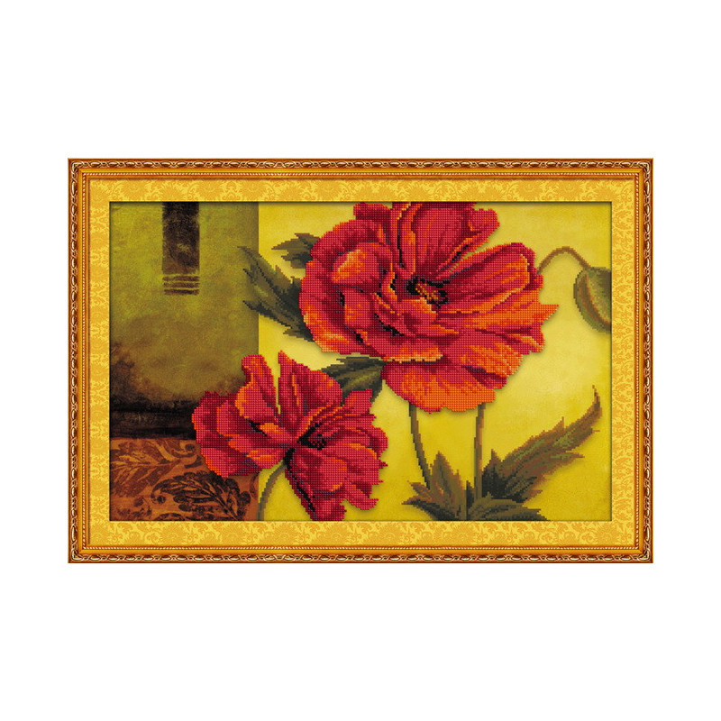 В состав набора входит: самоклеющаяся цветная схема,напечатанная на холсте, камни с номерами по цветам, пинцет, инструкция.