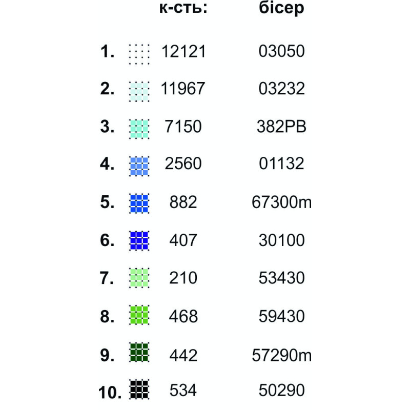 Також є титулка-ключ у якій прописані рекомендовані кольори бісеру Preciosa та їх кількість.