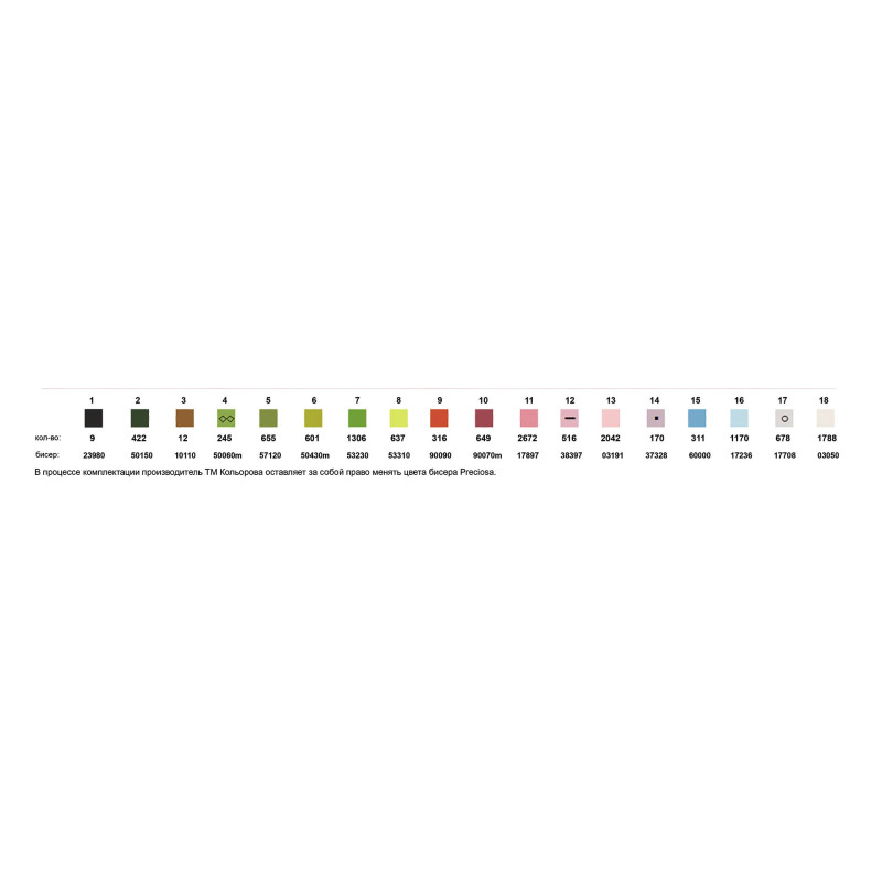 Також є титулка-ключ у якій прописані рекомендовані кольори бісеру Preciosa та їх кількість.