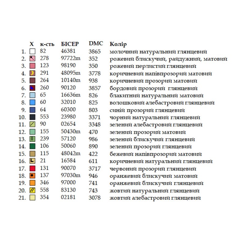 - титулка-ключ із рекомендованими кольорами бісеру Preciosa або муліне DMC та їх кількістю.