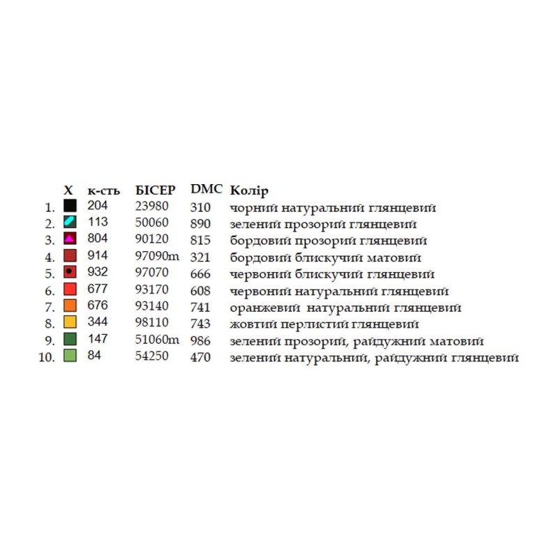 - титулка-ключ із рекомендованими кольорами бісеру Preciosa або муліне DMC та їх кількістю.