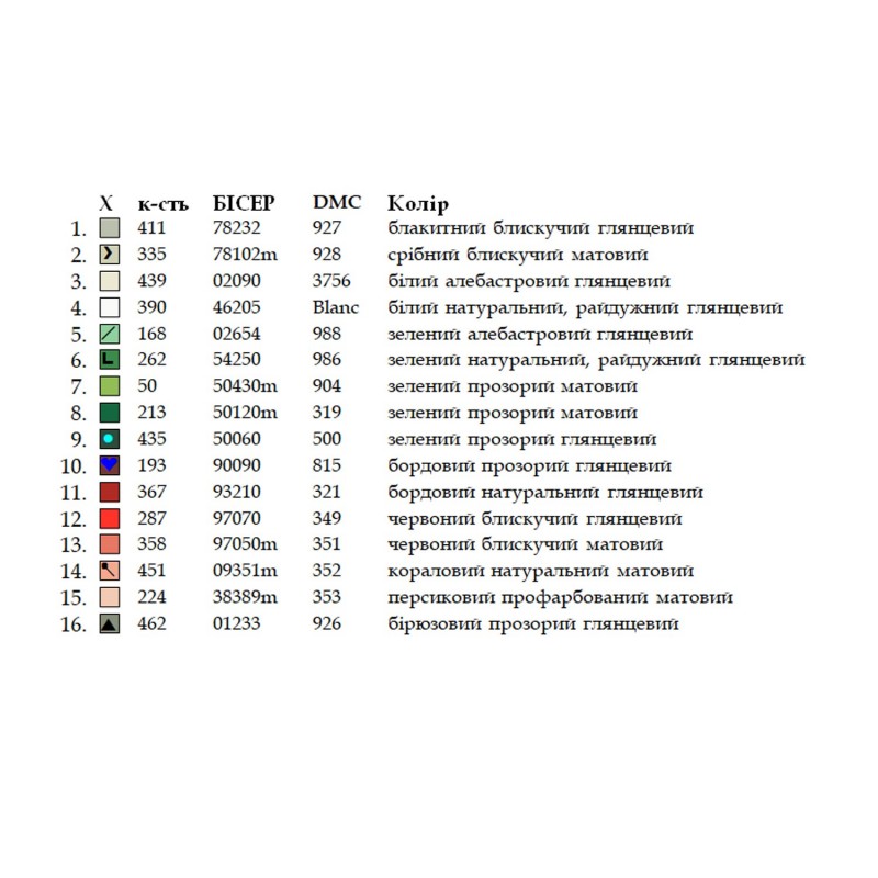 - титулка-ключ із рекомендованими кольорами бісеру Preciosa або муліне DMC та їх кількістю.