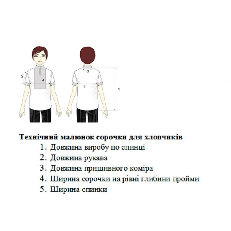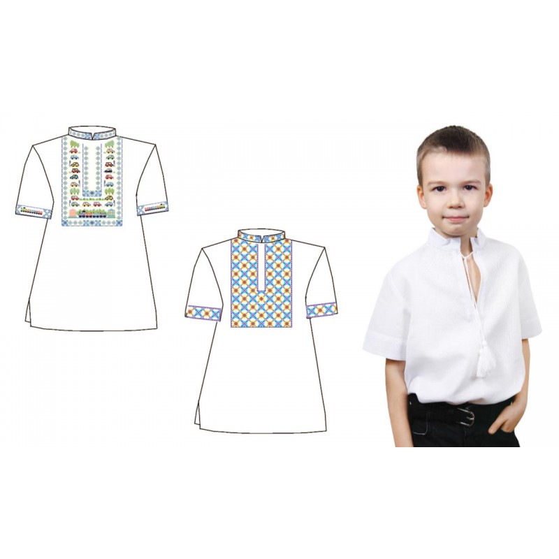Готова біла сорочка для хлопчиків із вставками під вишивку нитками. Вставки розташовані так, як показано на малюнку. Сорочка з коротким рукавом та коміром стійка.