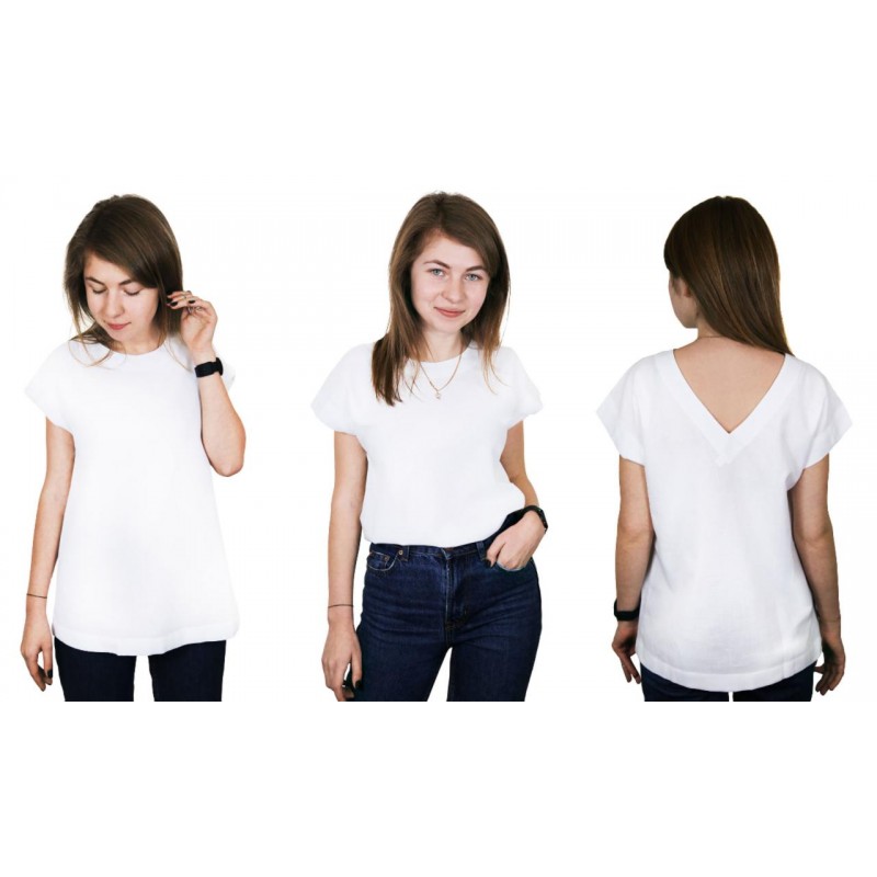 Готовая женская блуза с треугольным вырезом со вставками под вышивку бисером и крестиком. Блуза белого цвета с короткими рукавами.