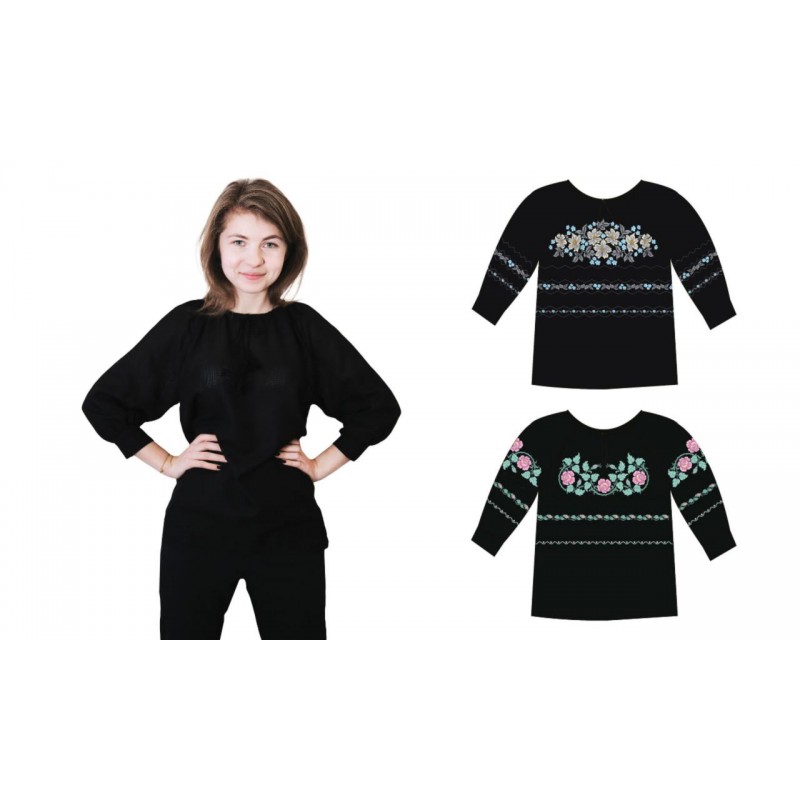 Готовая женская сорочка со вставками под вышивку бисером и стразами. Вставки расположены так, как показано на схеме. Сорочка чорного цвета с рукавом 3/4.