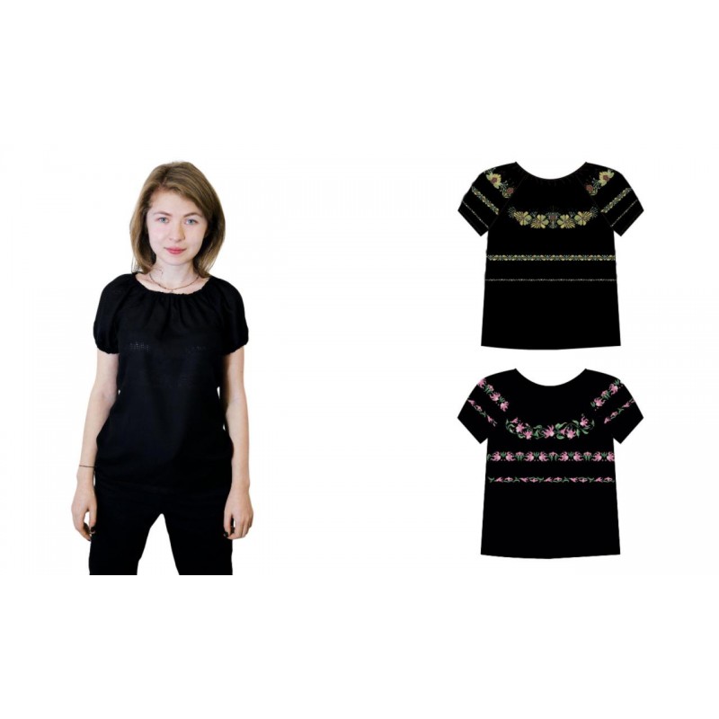 Готовая женская сорочка со вставками под вышивку бисером и стразами. Вставки расположены так, как показано на схеме. Сорочка чорного цвета с рукавом 3/4.