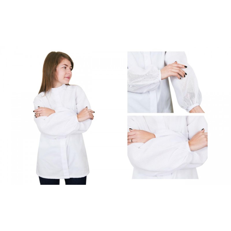Готовая белая женская сорочка со вставками под вышивку нитями. Вставки расположены так, как показано на рисунке. Сорочка с длинным рукавом и воротником стойка.